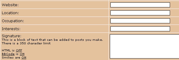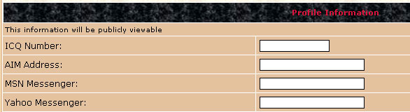 ICQ, AIM, MSN and Yahoo are instant messaging programs that allow you to type live back and forth with another person or even as a group or conference. If you use these and would like other members to know you can be reached this way then enter your info for that service and a button will appear on all of your posts for others to reach you by. For more information on these services please use your favorite internet search engine.