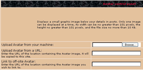 Avatars are the special images you see to the right of members posts that are not related to HD Library. The image size must be 100X100 pixels or less. The three choices are self explanatory.