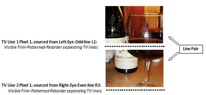 On the other hand, a typical passive 3DTV takes from the disc the first line of the left image and interleaves it with the second line from the right image. The TV does the same with the 3rd line of the left and the 4th of the right, and so on. In other words the TV merges lines from both images so the even lines of the left image and the odd lines of the right image are ignored by the 3DTV sampling, so the resolution of the panel is shared by the two half-resolution images.
