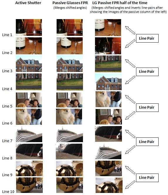 LG's Passive Glasses (FPR), merges left/right half-resolution images, and up-side-down half of the time