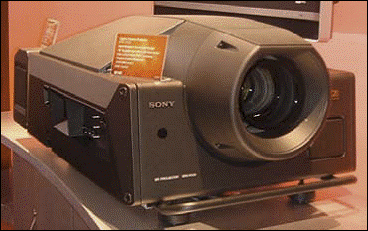 SRX-R110, introduced at Digital Cinema Laboratory in Hollywood, CA; resolution of 4096x2160, judged as with a picture quality of at least 35 mm, 10000 ANSI lumens, expected in movie theaters by 2005, dual-screen mode for the projection of dual 1920x1080 images, and quad-mode for four 1920x1080 images, $80,000, $15,000 extra for lens, TTM Jan 05, suitable for up to 40 feet wide screens.